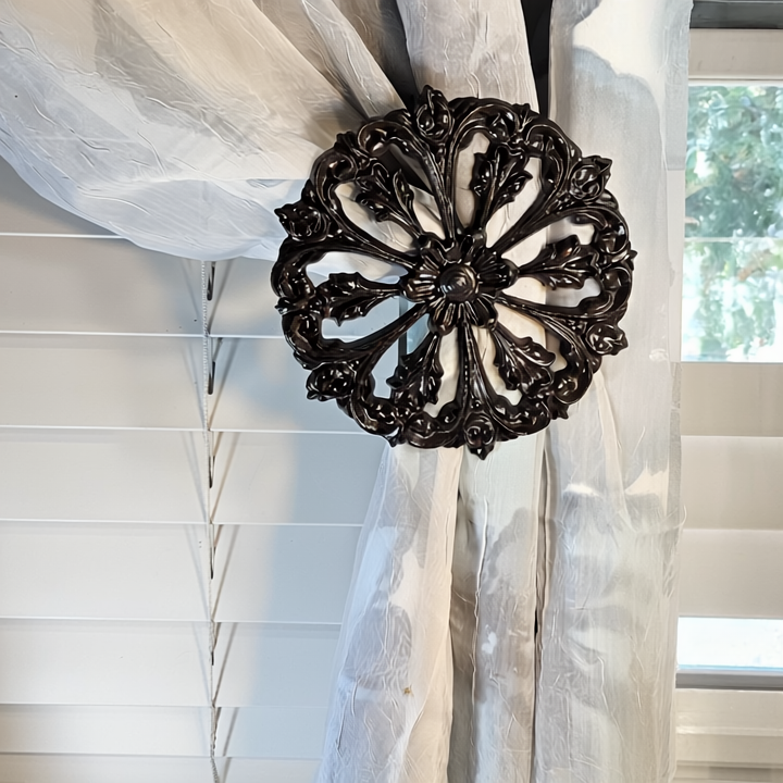 Use them as holdbacks, tiebacks, swag hooks, knobs, or full panel hangers—these medallions work beautifully with any drapery or curtain style: swags, slouches, scarves, or panels. Who needs boring rods?